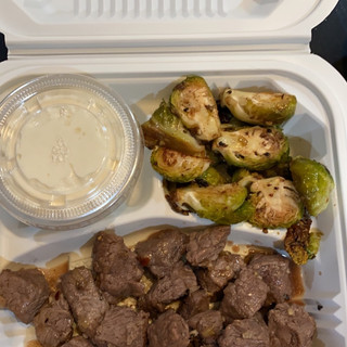 Lunch - Cajun Butter Steak Bites by Café Delites + baked Brussel sprouts + cottage cheese